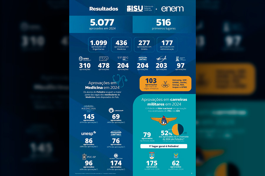 Entre os investimentos mais importantes, destacamos a aquisição do sistema Poliedro de Ensino. Há mais de 30 anos, o Poliedro desenvolve um método próprio de pensar a educação, alcançando resultados expressivos, conforme demonstrado na imagem acima:
