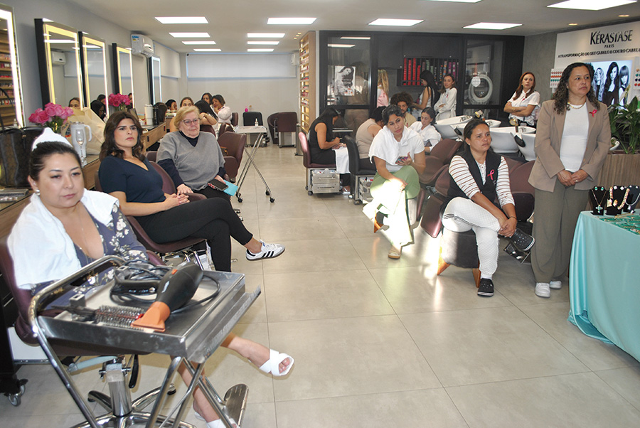 O prestigiado ST Concept de Arujá promoveu na tarde de 23 de outubro, último, em parceria com a Digimax Diagnóstico, um comovente evento no qual reuniu amigos, clientes e parceiros com o objetivo de ressaltar a importância do mês para a prevenção do câncer de mama. “O evento surgiu assim, do acaso, como se Deus o tivesse providenciado. A Priscila, uma querida cliente nossa que também trabalha no Digimax estava aqui lavando o cabelo e começamos a conversar sobre o assunto e assim nasceu a ideia”, contou Tais Santos que, de pronto, contou com o apoio incondicional da sócia Lais Lima.