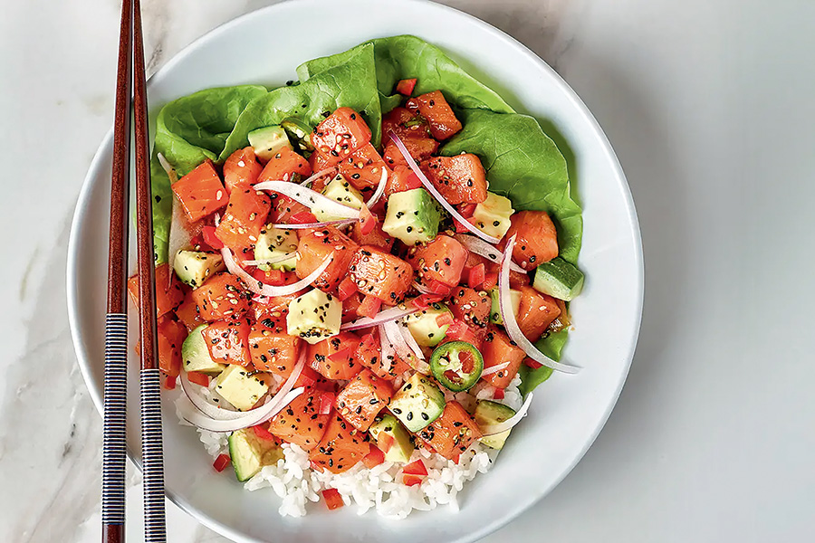 Poke de salmão, abacate e alface