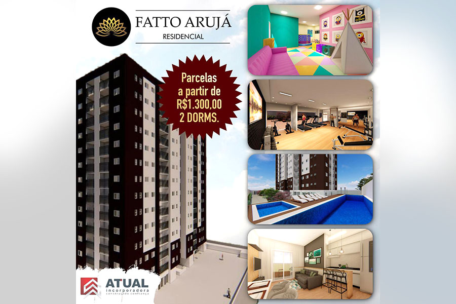 Construído pela Atual Incorporadora, que já assina outros empreendimentos na cidade e região, o Fatto Arujá oferece uma ampla estrutura com salão de festa, academia, brinquedoteca, piscinas, solarium, playground e muito mais, com parcelas a partir de R$ 1.300,00.