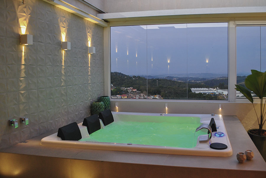 Com uma vista panorâmica da cidade de Arujá, Karla buscou trazer ao espaço elementos para que o morador chegue em casa e possa relaxar. Para tal ela utilizou o Spa Taylor, da Riolax, que possui um tamanho compacto para 4 a 6 pessoas e atende bem uma família. Com jatos em aço inox, tubulação em PVC rígido, painel eletrônico com sensor de nível, acabamento em acrílico e motobomba silenciosa, por si só o spa oferece integração, convívio, lazer e inovação. Para aconchegar ainda mais o ambiente, Karla optou por uma cobertura retrátil de vidro, para que o ambiente seja aproveitado tanto durante o dia quanto à noite.